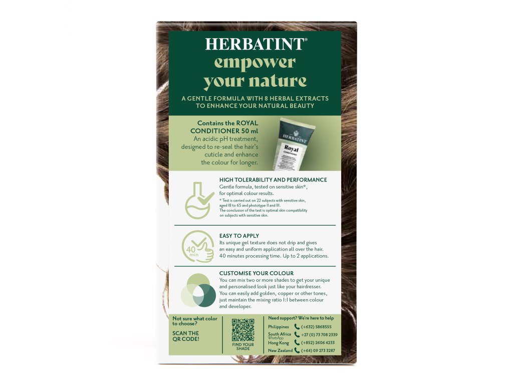 The fact that Herbatint dyes contain a much smaller amount of sensitizing substances than conventional hair dyes is also reflected in the conclusion of testing the product on specially selected individuals with a predisposition for sensitive skin, which reacts with redness or edema within 48 hours after exposure. Out of 160 tests, the entire Herbatint color range showed good to very good tolerance in subjects with such sensitive skin. The 36 natural-looking shades of permanent hair color contain 8 different organic herbal extracts, the combination of which strengthens and protects the hair while soothing the scalp.