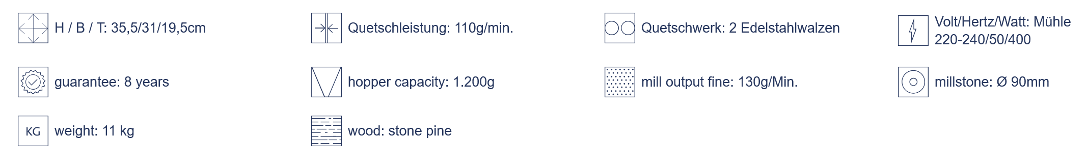 This means you can grind more grains without heating up and, in addition, with larger stones, you can grind finer flour. This feature is one of the most important parameters of our mills.