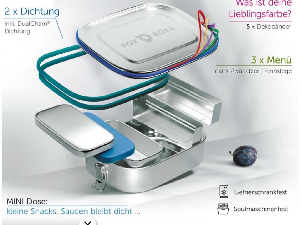 - 1x malá nerezová krabička Snack box 150ml se dvěma víčky (bio silikonovým nepropustným a kovovým netěsnícím)