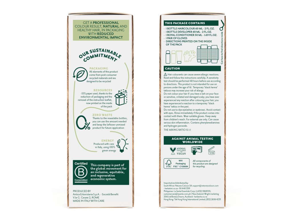 Výrobce zaručuje, že barvy Herbatint nejsou testovány na zvířatech, jsou vhodné i pro vegany a jejich papírovou část obalu, která je kontrolovaného původu, je možno plně recyklovat.