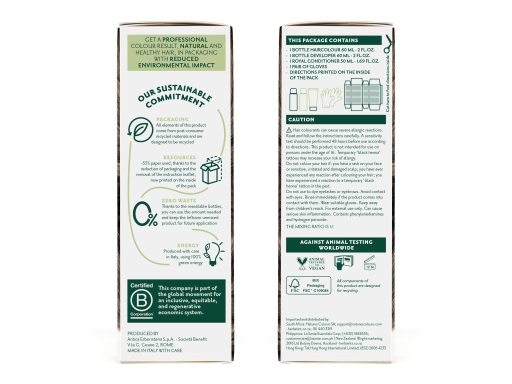 Výrobce zaručuje, že barvy Herbatint nejsou testovány na zvířatech, jsou vhodné i pro vegany a jejich papírovou část obalu, která je kontrolovaného původu, je možno plně recyklovat.